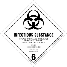 ![]() | 6.2 | Biohazard Infectious substance likely to cause death or injury if swallowed, inhaled or brought into contact with the skin. Includes bacteria, viruses, parasites and fungi. |
