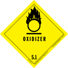 ![]() | 5.1 | Oxidising agent Substance that may not be combustible by itself, but may produce oxygen which increases the risk and intensity of a fire occurring in other materials. Includes ammonium nitrate and hydrogen peroxide. |